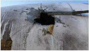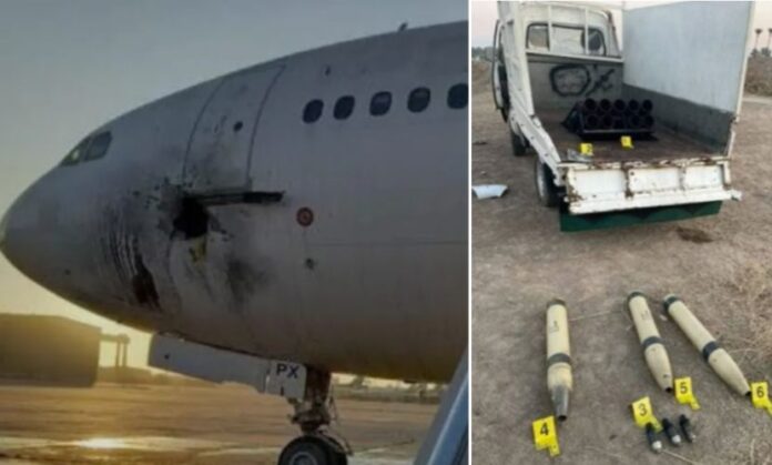 Collage. Et skadet fly og oppskytingsrør for raketter. Fra angrepet mot flyplassen i Bagdad fredag 28. januar. Foto: Iraqi Ministry of Interior.