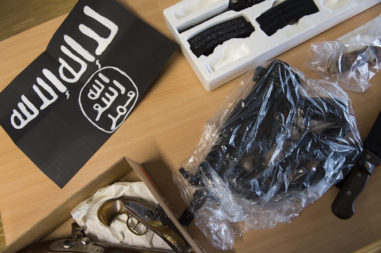 Seized weapons and an IS flag are on display during a news conference of the police in Goettingen, Germany, Thursday, Feb. 9, 2017. Twelve properties were searched in a raid in Goettingen. Police in central Germany say they have detained two known Islamic extremists in an investigation of possible plans for an attack. (Swn Pfoertner/dpa via AP)