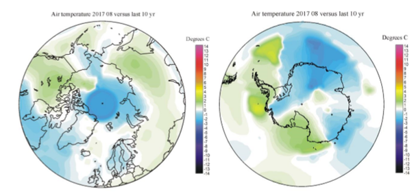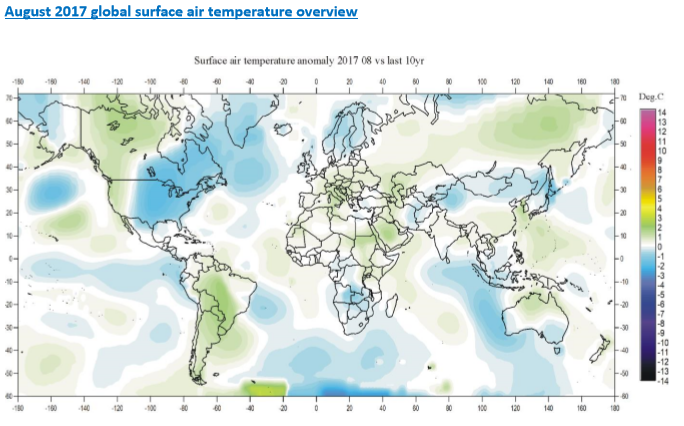 Her presenteres noen sentrale temperaturdata for august 2017, hentet fra Climate4you.