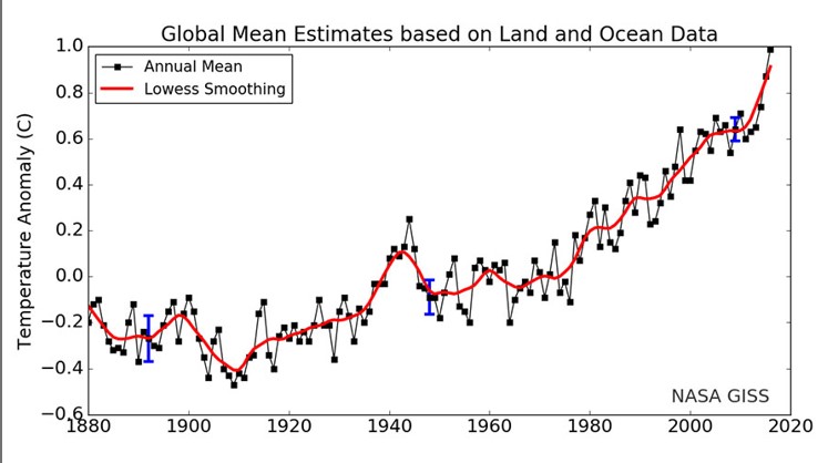 Ellers er det meste feil i det Eklund skriver. Den temperaturutviklingen Wiik viser til, er godt dokumentert, slik det er vist i kurven nedenfor. Usikkerheten i årsmidlene er indikert ved de blå strekene. Hvis en vil ha verdier med mindre usikkerhet, kan en ta midler for eksempel over fem år. Usikkerheten i midlet er da mindre enn halvparten av de viste verdiene. De høye verdiene i 1998 og i 2015/2016 er resultatet av økt menneskeskapt oppvarming kombinert med kraftige El Niño episoder. Flere forskergrupper kommer til omtrent samme temperaturtrend selv om metodene er litt ulike. Den lineære trenden fra 1970 er 0,18 grader per tiår. Dette stemmer svært bra med temperaturtrenden i lavere troposfære beregnet fra satellittdata ifølge Mears & Wentz (American Met. Soc. Oktober 2017).
