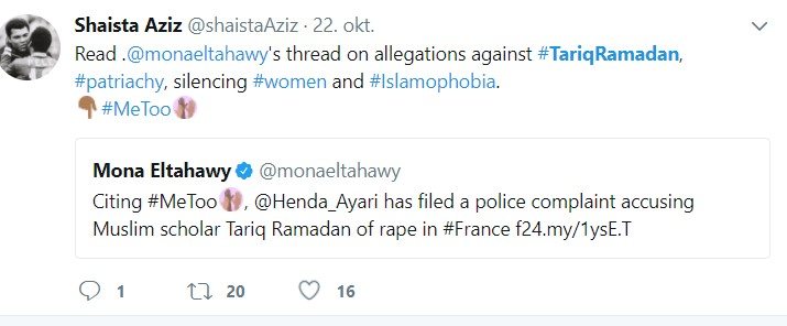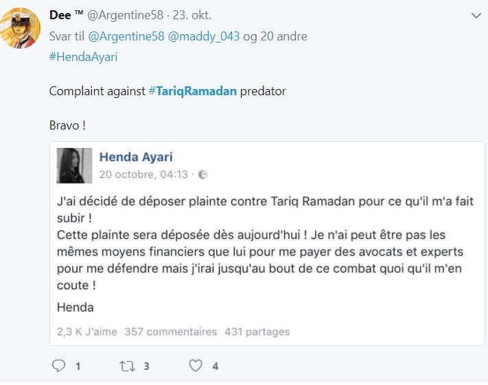 – Jeg bekrefter i dag at den berømte Zubair er Tariq Ramadan, skrev hun senere på Facebook. Ifølge hennes advokat har hun ikke anmeldt saken tidligere fordi hun var redd. Men etter alle avsløringene de siste dagene i forbindelse med #meetoo-aksjonen bestemte hun seg for å gå til anmeldelse, sa hun til AFP.