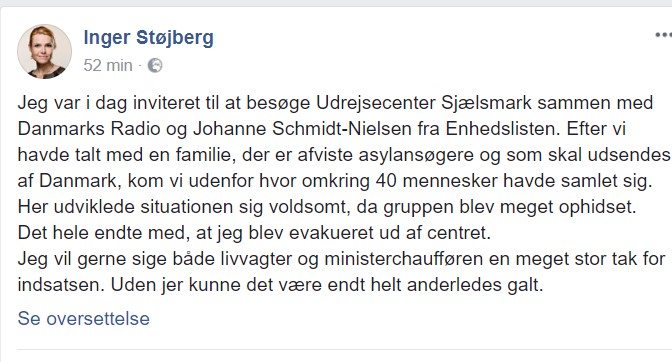 Inger Støjberg har selv kommentert hendelsen på Facebook. Der takket hun sine livvakter og sin sjåfør for rask reaksjon og påpeker at situasjonen kunne ha endt svært ille.