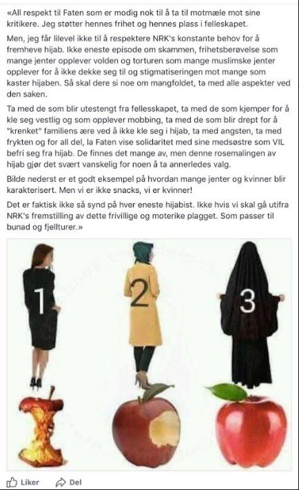 Denne Facebookposten er altså årsaken til at Shurika Hansen ble utestengt fra Facebook. Den ble postet sammen med et bilde med tre kvinner og tre epler. En i vestlige klær, en i hijab og en i nikab. Den vestlige kvinnen sammenlignes med et eple som nærmest er råttent, som for å illustrere at hun er ‘uren’ eller ‘eksponert’, mens kvinnen i nikab sammenlignes med et plettfritt eple som ser friskt og urørt ut.