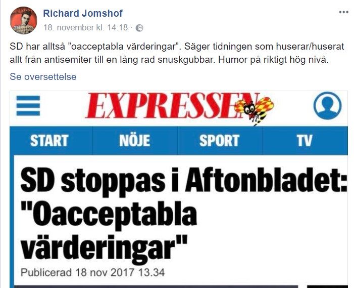 De siste ukene har det vært flere skandaleoppslag om medarbeidere i Aftonbladet, blant annet påstander om seksuell trakassering og voldtekter. Riksdagsmedlem for Sverigedemokratene Richard Jomshof kommer derfor med denne kommentaren på Facebook: