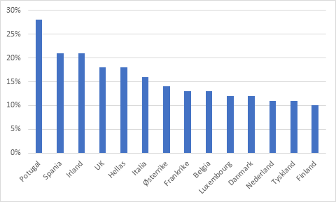 Figur 1 Prosentvis økt vinterdødelighet relativt til dødelighet i resten av året (1988-1997) for 14 EU land (J D Healy 2003)