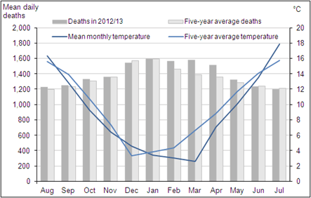 Figur 3 viser antall som døde daglig i England og Wales for hver måned i året 20012/13 ved de sorte søylene. De grå søylene viser gjennomsnittlig årsvariasjon basert på de siste fem årene. Antall som dør daglig varierer mellom 1.200 og 1.600. Det går tydelig frem at det dør betraktelig flere i månedene november, desember, januar, februar, mars og april enn det gjør ellers i året.