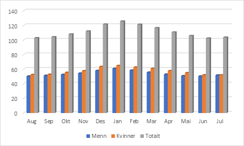 Figur 4 viser antall daglige dødsfall i Norge for menn, kvinner og totalt for årets måneder basert på gjennomsnitt for årene 2014 – 2016. Akkurat som for England og Wales viser figuren for Norge en markert topp i antall dødsfall i vintermånedene. Januar er måneden med høyest antall daglige dødsfall, mens månedene juni, juli og august har lavest antall dødsfall. Det er høyest antall daglige dødsfall fra kvinner i forhold til menn, noe som skyldes av kvinner har lengre levealder enn menn.