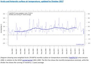 Sammenligningen av temperaturutviklingen viser en langsiktig trend; temperaturen i Arktis øker svakt mens det motsatte skjer i Antarktis.