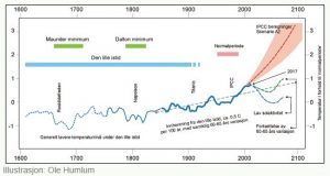 Denne figuren viser både viktige temperaturverdier inntil 400 år tilbake og helt forskjellige estimater om fremtiden. Merk den langsiktige temperaturutviklingen og den lange (60 – 65 år) variasjonen. Skråsikre utsagn basert på få års utvikling gis stor oppmerksomhet, men har liten betydning i det egentlige og langsiktige perspektiv.
