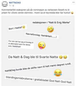 I teksten over collagen «Fra Kommentarfeltet» på Natt&Dags Facebook-vegg står det at Resett er nominert til Årets Verste Stemme, mens på Natt&Dags hjemmeside står det Helge Lurås, hvem er av dem får pokalen?