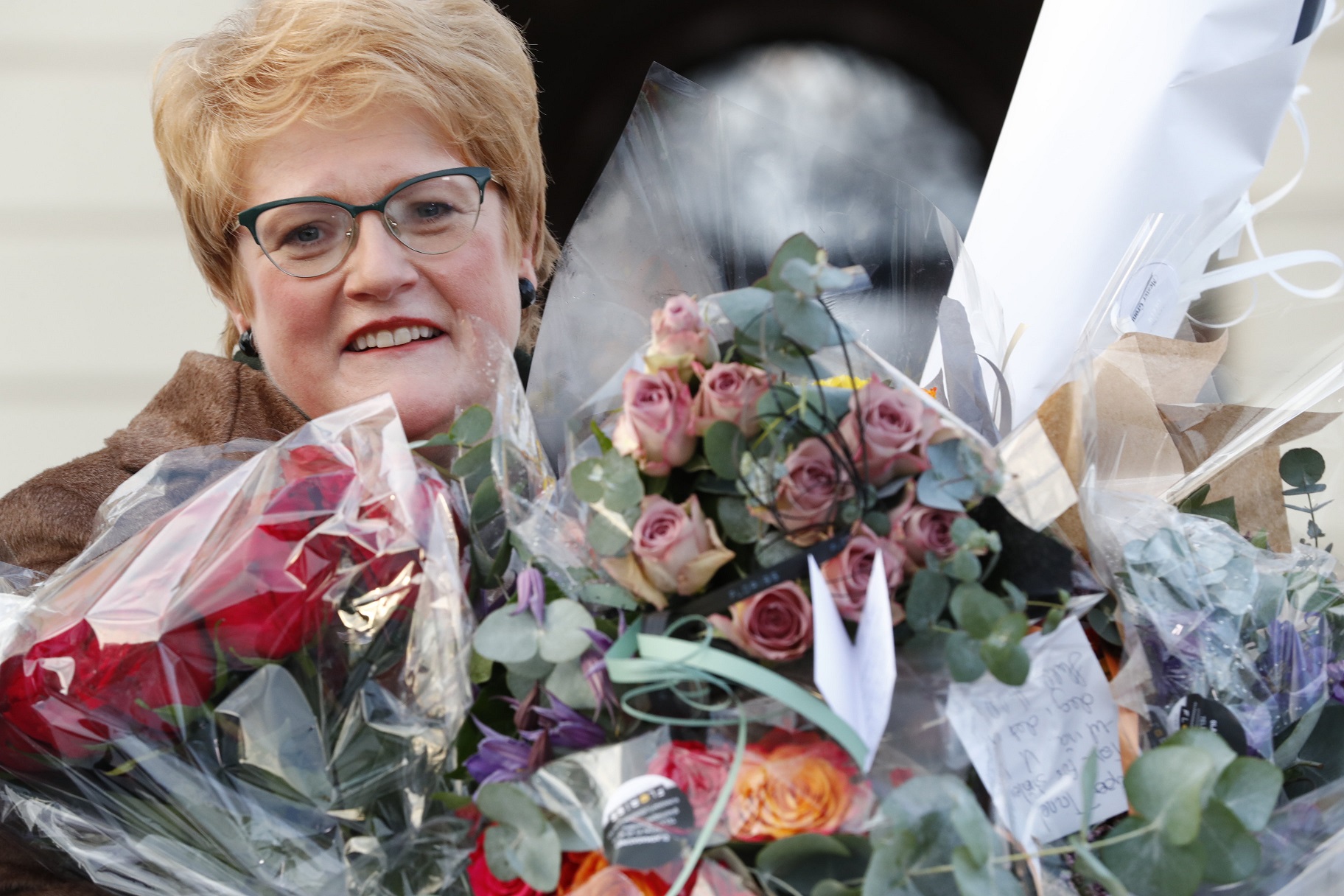 En tydelig stolt ny regjering ble møtt av smilende venner da de presenterte seg på Slottsplassen klokken 14.17. Etter klemmer og håndtrykk ble statsrådene overrakt blomsterbuketter. Aller flest ble det til Venstre-lederen, som slet med å få plass til alle bukettene.