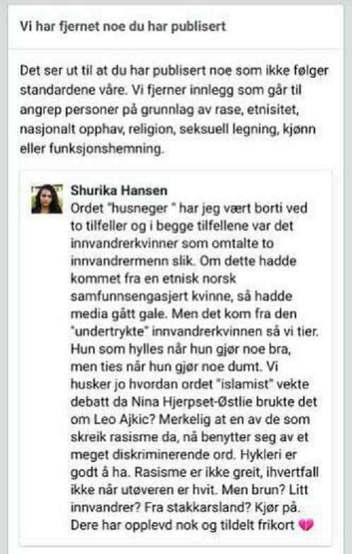 Resett-kommentator og samfunnsdebattant Shurika Hansen er ikke uvant med utestengelse fra Facebook. I midten av november kunne Resett først opplyse om at Hansen ble utestengt for sin kritikk av en vanlig forekommende holdning i islam, der kvinner anses som verdifulle gjenstander som bør gjemmes bort med slør, for sitt eget beste. Dette resulterte i en midlertidig karantene.