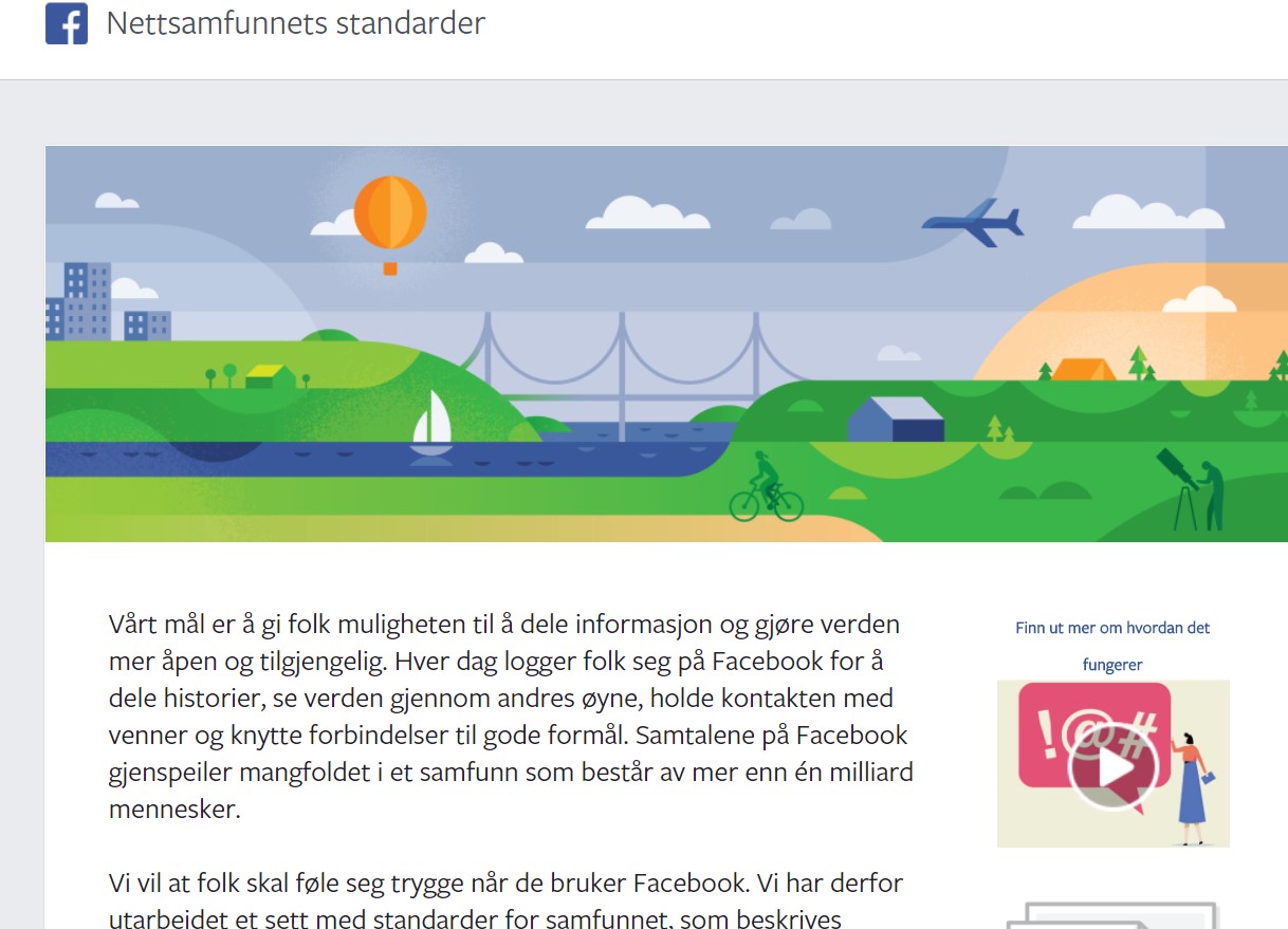 Men ikke så galt at det ikke er godt for noe, Facebook sendte oss muntert videre til «Nettsamfunnets standarder», som indikerer at målet til Facebook er «å gi folk muligheten til å dele informasjon og gjøre verden mer åpen og tilgjengelig», fordi «samtalene på Facebook gjenspeiler mangfoldet i et samfunn….»