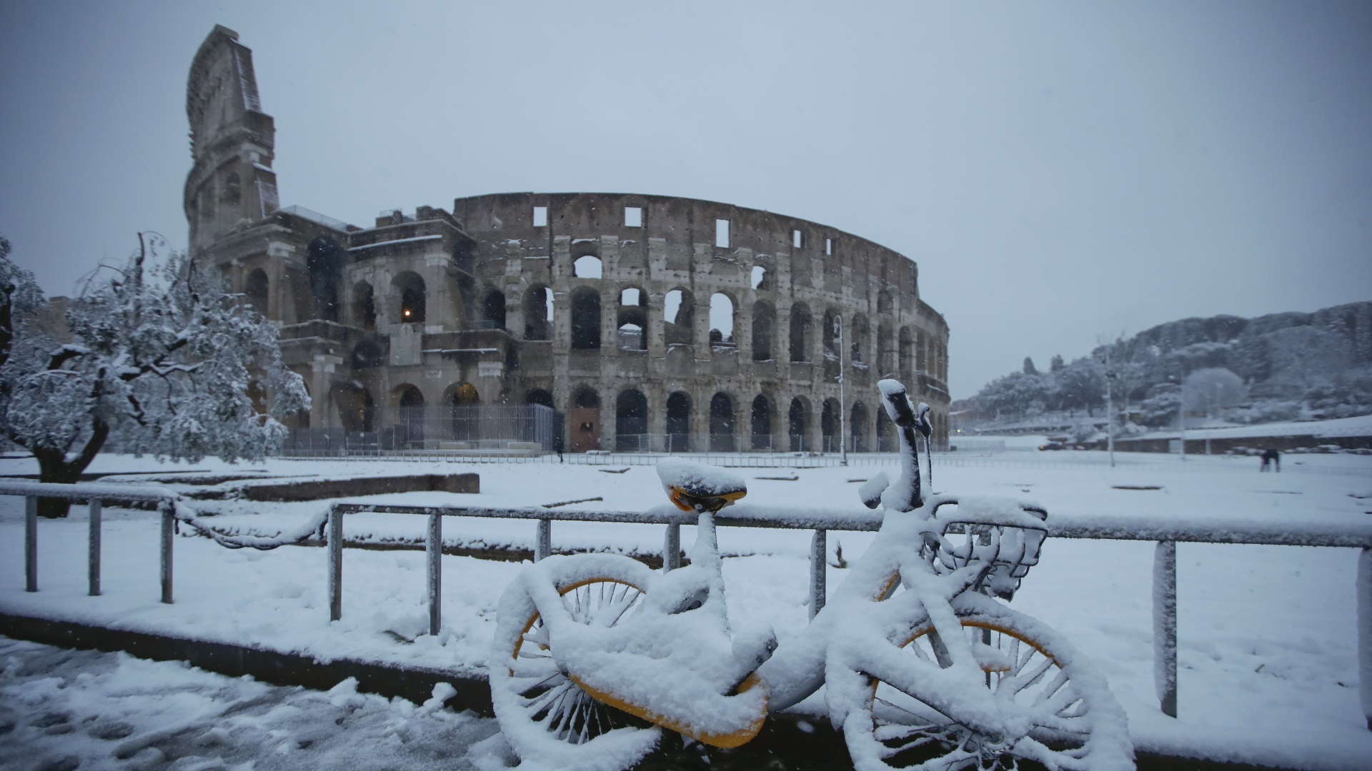 En kaldfront med snø, regn og sterk vind fra Sibir nådde Italia søndag – og mandag kom snøværet til Roma. Colosseum, samt nærliggende Forum Romanum og Palatinerhøyden, har blitt stengt som følge av det uvanlige været.