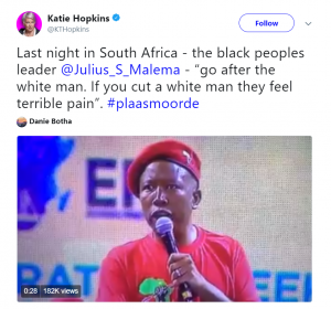 – Vi må fjerne borgermester av Port Elizabeth fordi han er en hvit mann. Vi må gå etter den hvite mannen og kutte strupen av hvithet. Den hvite mann føler enorm smerte når du kutter han, uttalte Malema som høstet stor applaus.
