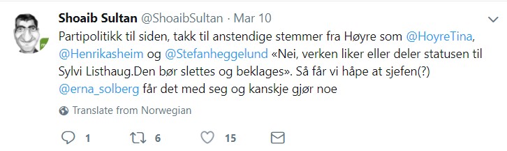 – Partipolitikk til siden, takk til anstendige stemmer fra Høyre som @HoyreTina, @Henrikasheim og @Stefanheggelund. Så får vi håpe at sjefen(?) @erna_solberg får det med seg og kanskje gjør noe, skrev Sultan på Twitter.