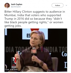 Hillary Clinton fortalte et publikum i India at USA ikke «fortjener» Donald Trumps presidentskap og mener Trumps velgere er rasister og kvinnehatere.