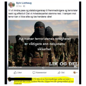 – På tide at en fremmedkriger setter en kule i panna på den onde, kristne f***a der. Håper hun blir gjengvoldtatt så inn i helvete, skrev en Facebook-bruker under Listhaugs bilde i forrige uke.