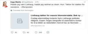 Siste uke har som du sa vært surrealistisk. Helt uten sammenheng har du og ditt FB innlegg blitt koblet til 22.7 og den terroren som fant sted på Utøya. Fått ABB sine synspunkter og holdninger tillagt deg fra Støre. Selv blomstene du fikk, ble koblet til terror og tillagt høyreekstremistiske baktanker. Mens det var omtanke til deg som person, som gikk igjennom en tøff tid. Der du ble angrepet fra alle kanter. Det kalles nestekjærlighet å vise omtanke. Men selv det ble vridd på. Inga Marte Torkildsen kalte oss alle rasister.