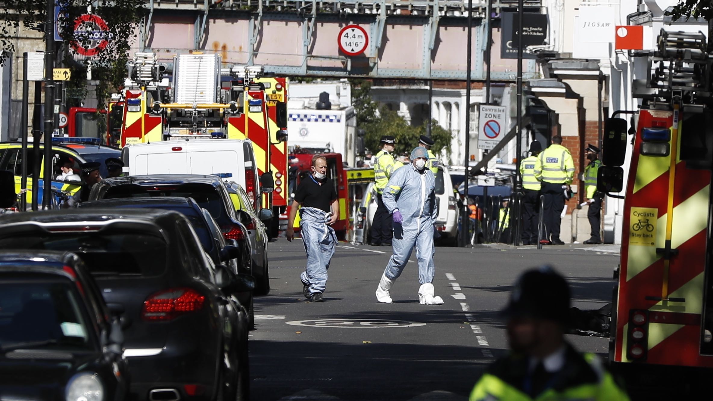 FILE - In this Friday, Sept. 15, 2017 file photo, police forensic officers walk within a cordon near where an incident happened, that police say they are investigating as a terrorist attack, at Parsons Green subway station in London. A jury has convicted an Iraqi teenager of attempted murder for planting a bomb on a London subway train. Ahmed Hassan, who is 18, showed no emotion as he was found guilty on Friday, March 16, 2018 at London's Central Criminal Court. He will be sentenced later. (AP Photo/Kirsty Wigglesworth, File)