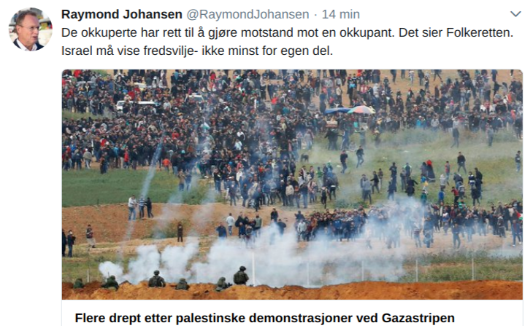 Leder for Oslo byråd Raymond Johansen (Ap) har gitt en oppsiktsvekkende hyllest til de palestinske opprørerne på Twitter i det uroen herjer som verst.