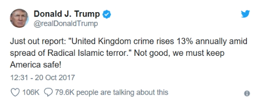 I oktober 2017 reagerte Donald Trump på den rapporterte økningen i kriminalitet i Storbritannia og knyttet den i en tweet til spredningen av radikal islam og derfor innvandring.
