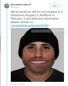 Politiet i Warwickshire, England er i ferd med å bli verdensberømte for en fantomtegning av en mistenkt innbruddstyv. Den mistenkte er en av to personer som skal ha lurt seg inn i en kvinnes leilighet 5. februar. Den ene mannen skal ha distrahert kvinnen, mens den andre skal ha funnet og rappet pengene.