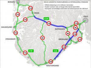 Kartet viser hvordan to veistrekninger fremstår som spesielt interessante kandidater for den høyeste fartsgrensen på 130 km/t: Sande – Grimstad og Notodden – Røldal. Dette er transportetapper som knytter store byer og landsdeler sammen på en effektiv måte. Sande – Grimstad knytter sammen fire av de åtte største byområdene i Norge: Oslo, Drammen, Grenland og Kristiansand, mens Notodden – Røldal knytter sammen hele fem av de åtte største: Oslo, Bergen, Stavanger, Drammen og Grenland. For å få dette til trenger vi politikere som er mer opptatt av nasjonens beste enn av å sende en hilsen hjem.