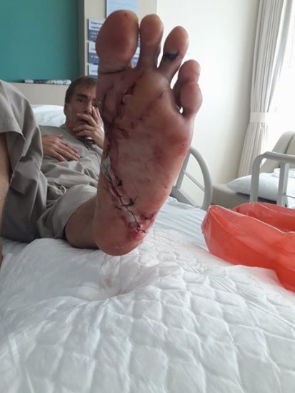 Danielsen fikk raskt hjelp og ble kjørt til sykehus. Nå har legene sydd 19 sting i foten, og nordmannen opplever at det går bedre og bedre.