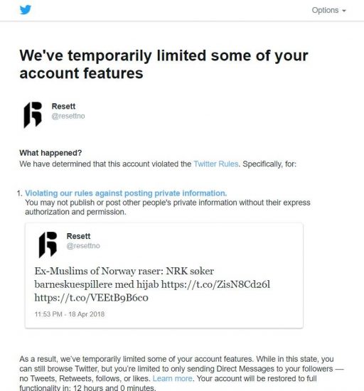 Twitter skriver i sin begrunnelse for utestengelsen at Resett ikke kan publisere private opplysninger fra andre personer uten deres samtykke.