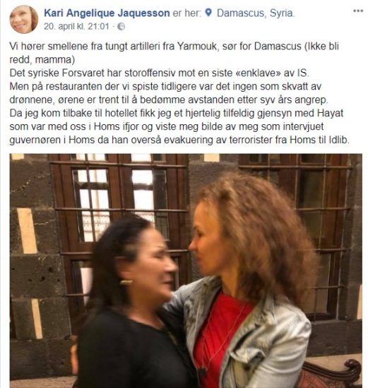 Men uansett, Jaquesson er i Syria og forteller på Facebook-siden sin om hvordan de hører bombene falle.