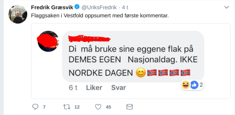 – Flaggsaken i Vestfold oppsummert med første kommentar, skriver den Trump-opphengte journalisten hånlig på Twitter.