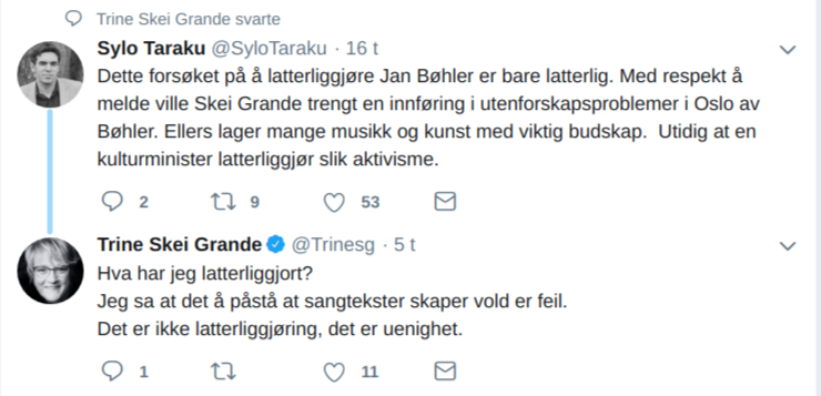 – Dette forsøket på å latterliggjøre Jan Bøhler er bare latterlig. Med respekt å melde ville Skei Grande trengt en innføring i utenforskapsproblemer i Oslo av Bøhler. Ellers lager mange musikk og kunst med viktig budskap. Utidig at en kulturminister latterliggjør slik aktivisme, skriver han.