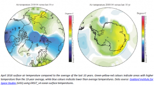 Denne presentasjonen viser samme tendens som mars, men motsatt tendens fra tidligere måneder. Temperaturen synker noe for Arktis og stiger noe for Antarktis – men det er snakk om små forandringer.