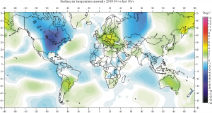 For kloden som helhet var den gjennomsnittlige nær gjennomsnittet for de 10 siste år. For den nordlige halvkule var det, som i mars, betydelige regionale forskjeller. Nord-Amerika og vestlige Russland var relativt kalde, mens Europa og østlige Sibir hadde temperatur over det normale. Akkurat dette er noe vanskelig å forstå – ut fra en april som var ekstra kald både i Norge og i Europa. Nær ekvator var temperaturen under det normale. Som en helhet var temperaturen nær eller noe lavere enn middelet for de 10 siste år. På den sydlige halvkule var temperaturen også nær eller noe lavere enn middelet for de 10 siste år, med Antarktis som et unntak, her var temperaturen klart høyere enn middelet.