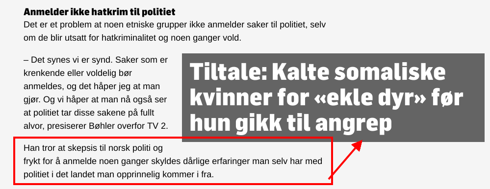 Leser man TV 2s artikkel får man et inntrykk av at det kun er hvite personer som står bak hatkriminalitet. For etter den lange Liban-historien bekrefter seksjonsleder i Politidirektoratet at «utlendinger er redd for å anmelde voldssaker til politiet.» Politi-sitatet er strategisk plassert ved siden av nyheten «Kalte somaliske kvinner ekle dyr før hun gikk til angrep».