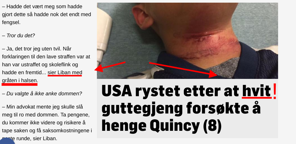Leser man litt lenger i TV 2s hit piece på hvite personer, så skjer det igjen. Denne gang er det en sak fra USA som blir lurt inn i artikkelen: «USA rystet etter at hvit guttegjeng forsøkte å henge Quincy (8)». Denne gang med et stort bilde av en hals full av blåmerker. Tilfeldig?