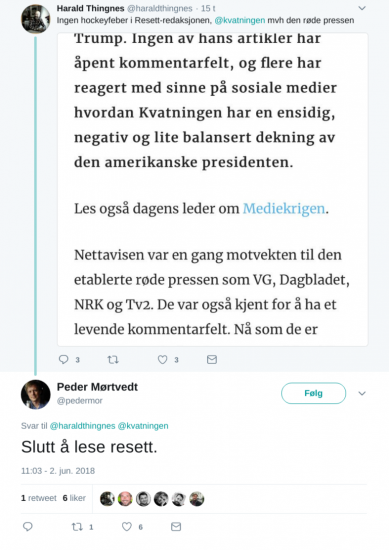 Da Resett skrev om Kvatningen i gårdagens artikkel der Nettavisen opplever en massiv leserflukt, følte Resett-leser og NRK-journalist Harald Thingnes at han måtte si fra til sin kollega.