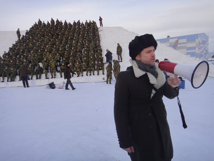 På en haug sto regissør Morten Traavik med russisk bjørneskinnslue og ropte i megafon til de vel 250 aktørene som satt på en fotballstadion i sentrum: – We are now making world history!