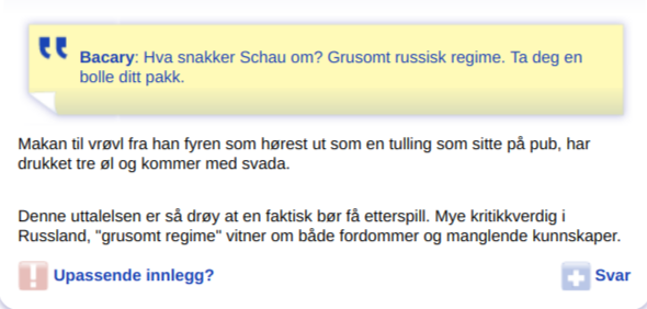 – Makan til vrøvl fra han fyren. Denne uttalelsen er så drøy at en faktisk bør få etterspill. Mye kritikkverdig i Russland, «grusomt regime» vitner om både fordommer og manglende kunnskaper, skriver en person på forumet til VG diskuter.