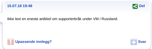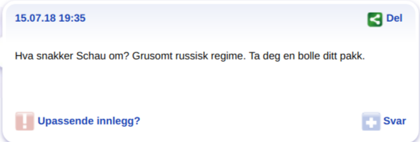 – Makan til vrøvl fra han fyren. Denne uttalelsen er så drøy at en faktisk bør få etterspill. Mye kritikkverdig i Russland, «grusomt regime» vitner om både fordommer og manglende kunnskaper, skriver en person på forumet til VG diskuter.