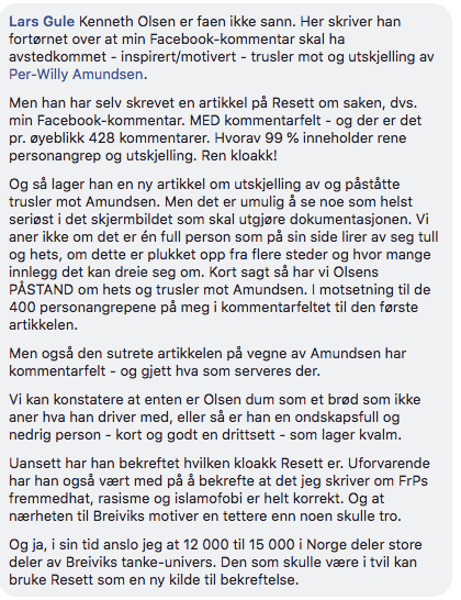 * Oppdatering 12:23, 25. juli: I en tidligere versjon av dette innlegget sto det at Lars Gule hadde slettet kommentaren fra Facebook. Gule har gjort Resett oppmerksom på at så ikke er tilfellet. Kommentaren med beskyldningene er fortsatt offentlig tilgjengelig på Facebook.