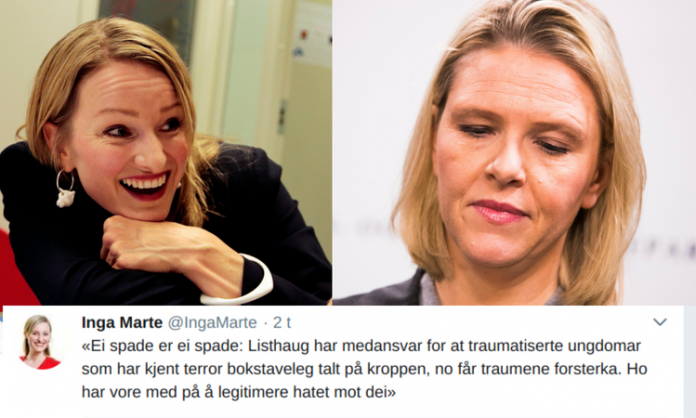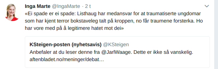 «Ei spade er ei spade: Listhaug har medansvar for at traumatiserte ungdomar som har kjent terror bokstaveleg talt på kroppen, no får traumene forsterka. Ho har vore med på å legitimere hatet mot dei», konkluderer han.