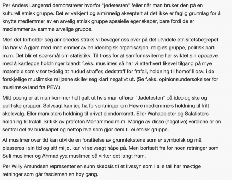 – Du kan kalle meg hylekor, naiv, godhetstyrann eller andre mobbenavn, men sannheten er at Per-Willy Amundsen har krysset en alvorlig grense. Han består ikke jødetesten, skriver Langerød på Twitter i det han linker til egen ytring i Aftenposten.
