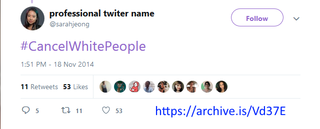 Democrats have redefined racism precisely so people like Sarah Jeong can say racist things and still get jobs at the New York Times. pic.twitter.com/ibjWFy5NLi