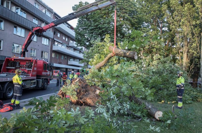 Kraftige vindkast fører til at trær faller over strømledningene. Hafslund har ikke full oversikt, og Schau advarer publikum om at noen steder kan ledninger ha falt til bakken.