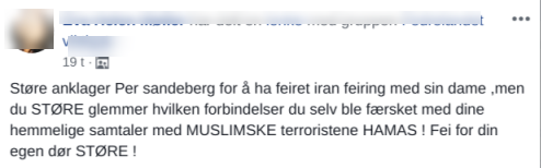 – Støre anklager Per sandeberg for å ha feiret iran feiring med sin dame ,men du STØRE glemmer hvilken forbindelser du selv ble færsket med dine hemmelige samtaler med MUSLIMSKE terroristene HAMAS ! Fei for din egen dør STØRE, skriver en person på Facebook.
