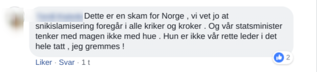 – Dette er en skam for Norge, vi vet jo at snikislamisering foregår i alle kriker og kroker. Og vår statsminister tenker med magen ikke med hue. Hun er ikke vår rette leder i det hele tatt, jeg gremmes, skriver en annen.