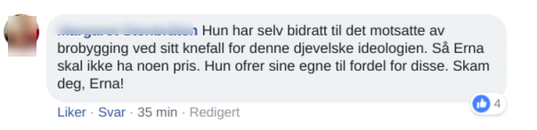 – Hun har selv bidratt til det motsatte av brobygging ved sitt knefall for denne djevelske ideologien. Så Erna skal ikke ha noen pris. Hun ofrer sine egne til fordel for disse. Skam deg, Erna, skriver en person på Facebook.