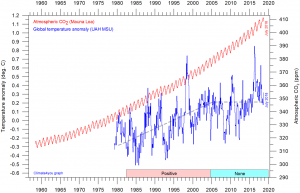 Merk den kaldere perioden 1960–1977 hvor samvariasjonen var negativ, ikke vist i denne figuren siden dette er satellittmålinger og de kom ikke skikkelig i gang før på 80-tallet. I den etterfølgende perioden var samvariasjonen fra positiv til ingen. Dette innebærer at det er ikke samvariasjon mellom CO2 og temperatur i dette tidsrommet som helhet.